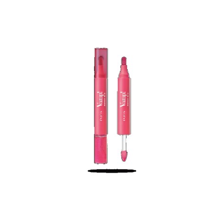D’un côté un feutre pour définir et colorer les lèvres très facilement, de l’autre un brillant-huile à lèvres à l’effet éclatant.