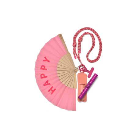 Accessoire portable composé d’une bandoulière réglable, de mousquetons amovibles, d’un porte-mascara, d’un éventail et d’une languette pour téléphone portable universelle.